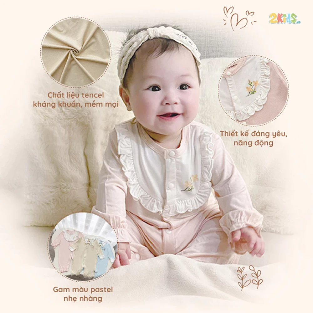 Bộ Body dài tay xuân hè được thiết kế liền thân, tỉ mỉ với phần bèo tiểu thư cắt phối trước ngực cho bé gái và phối cổ năng động cho bé trai mix cùng hình in nhỏ xing và kết hợp vs gam màu pastel nhẹ nhàng