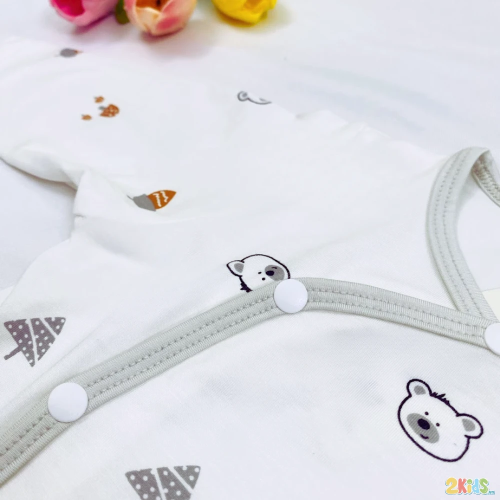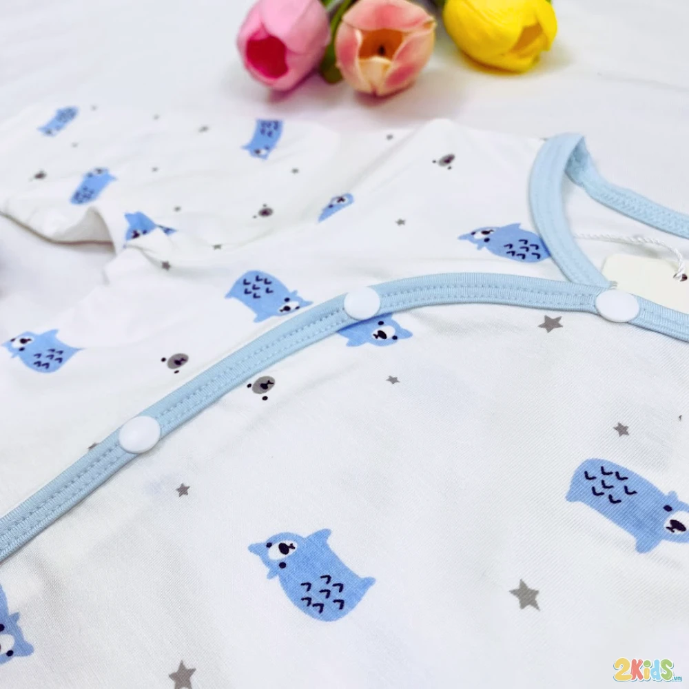 - Thiết kế cài chéo + khuy bấm tiện lợi: Giúp mẹ thay đồ cho bé dễ dàng, đồng thời giữ ấm phần ngực và bụng bé, tránh bị hở lạnh.