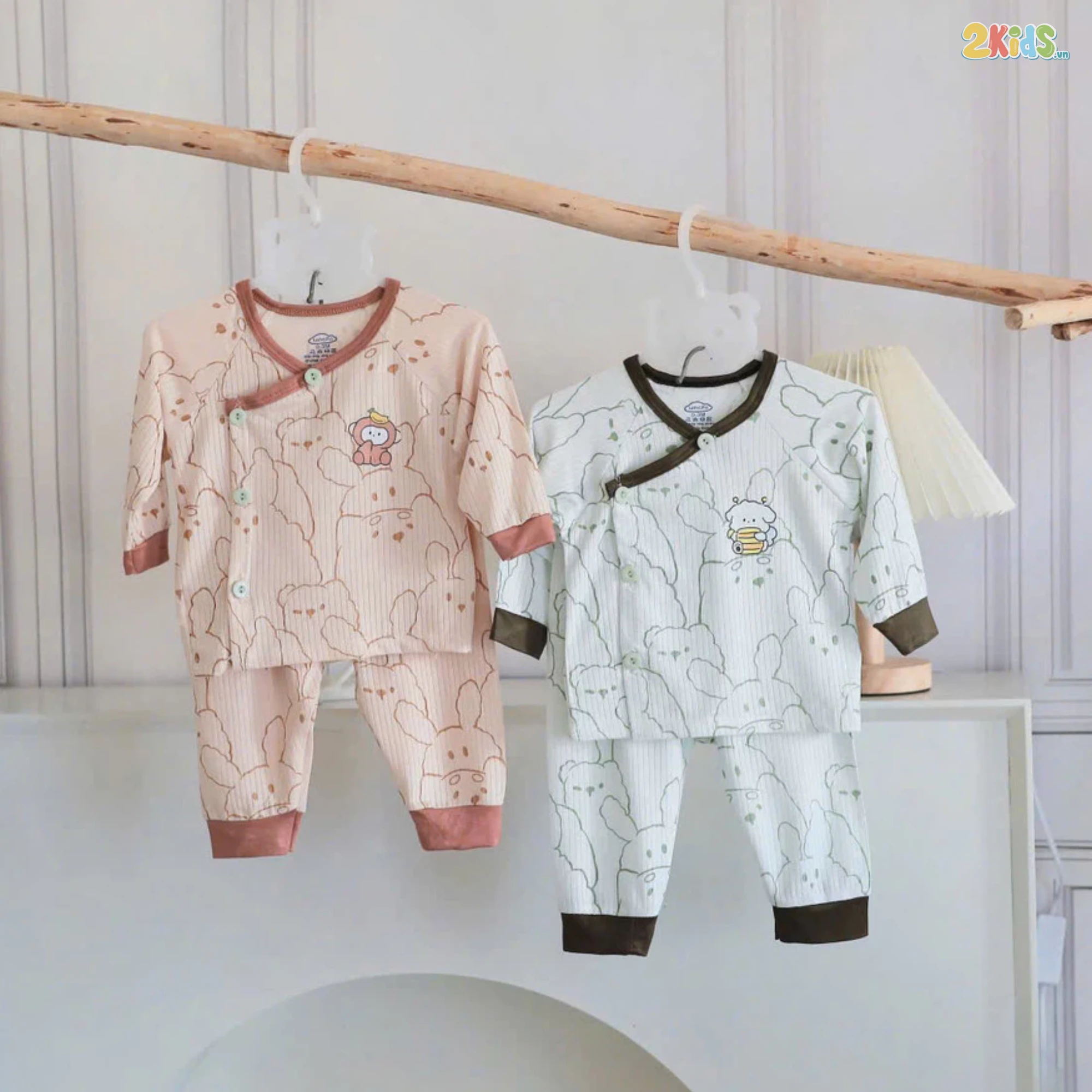 Bộ đồ có thiết kế cài chéo tinh tế, ôm gọn phần ngực và bụng, giúp giữ ấm hiệu quả, hạn chế gió lùa vào những vị trí dễ bị lạnh. Đây là kiểu dáng lý tưởng cho các bé sơ sinh, chưa biết lật hoặc chưa thể kiểm soát thân nhiệt tốt như người lớn.
