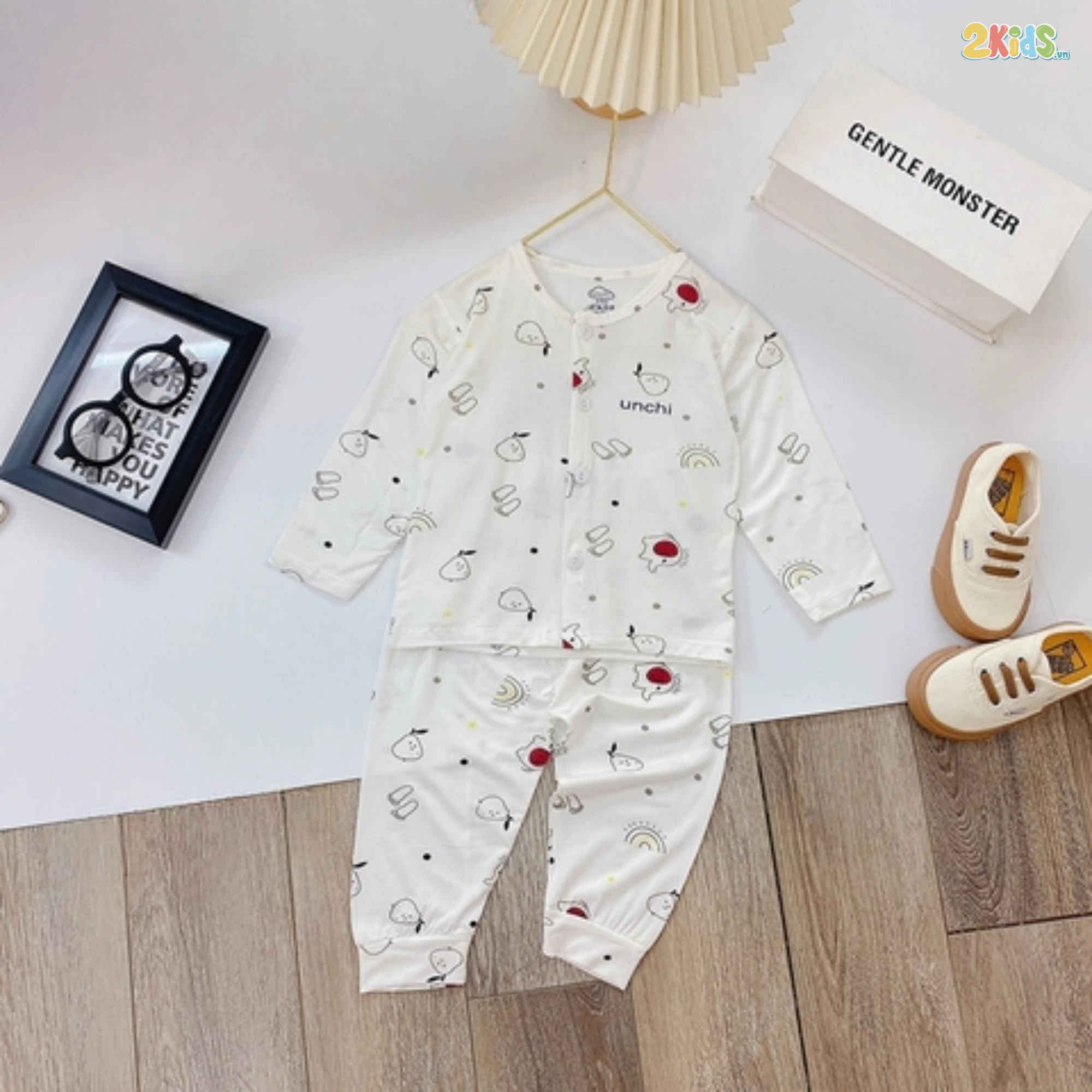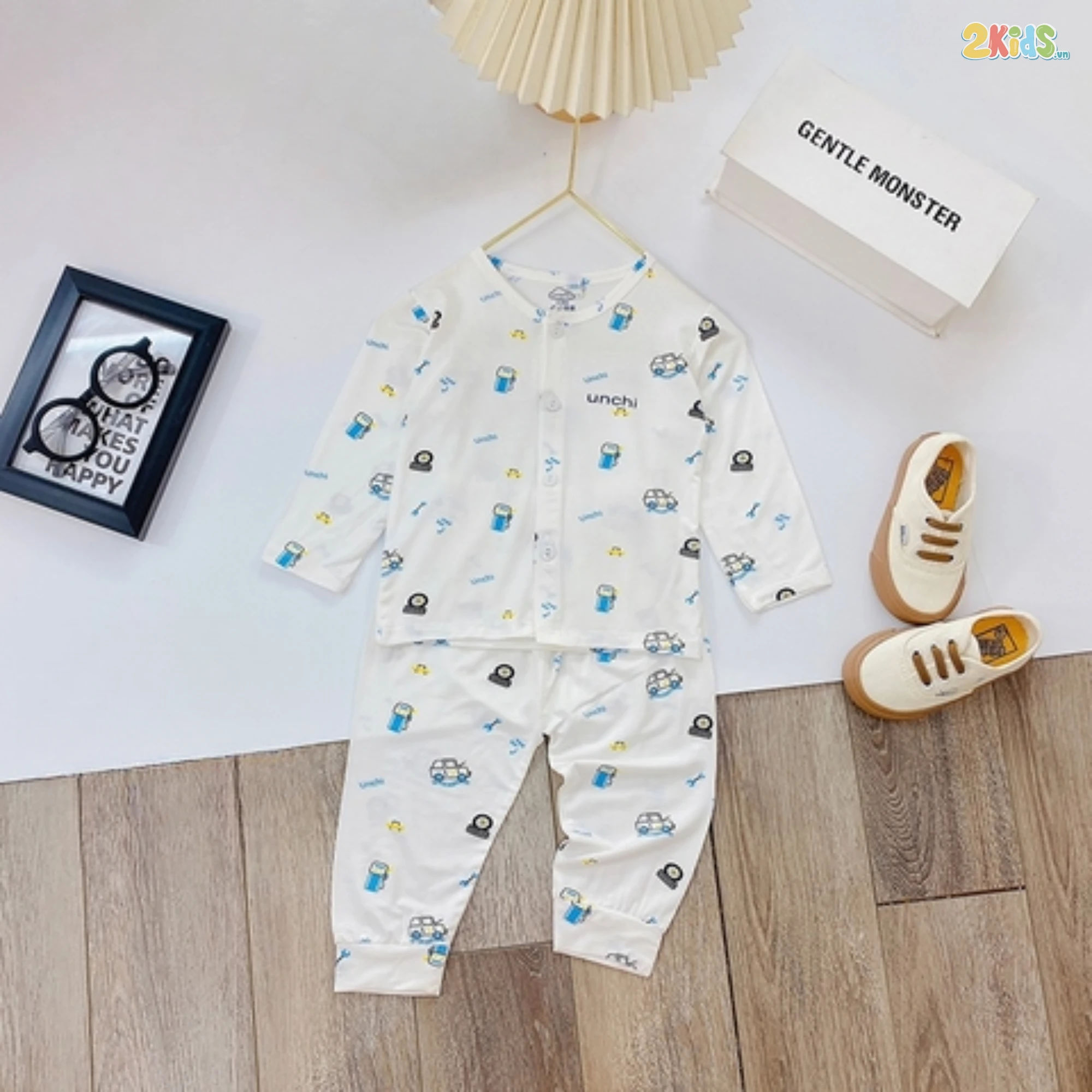 Bộ sơ sinh dài tay Unchi trắng in hoạ tiết