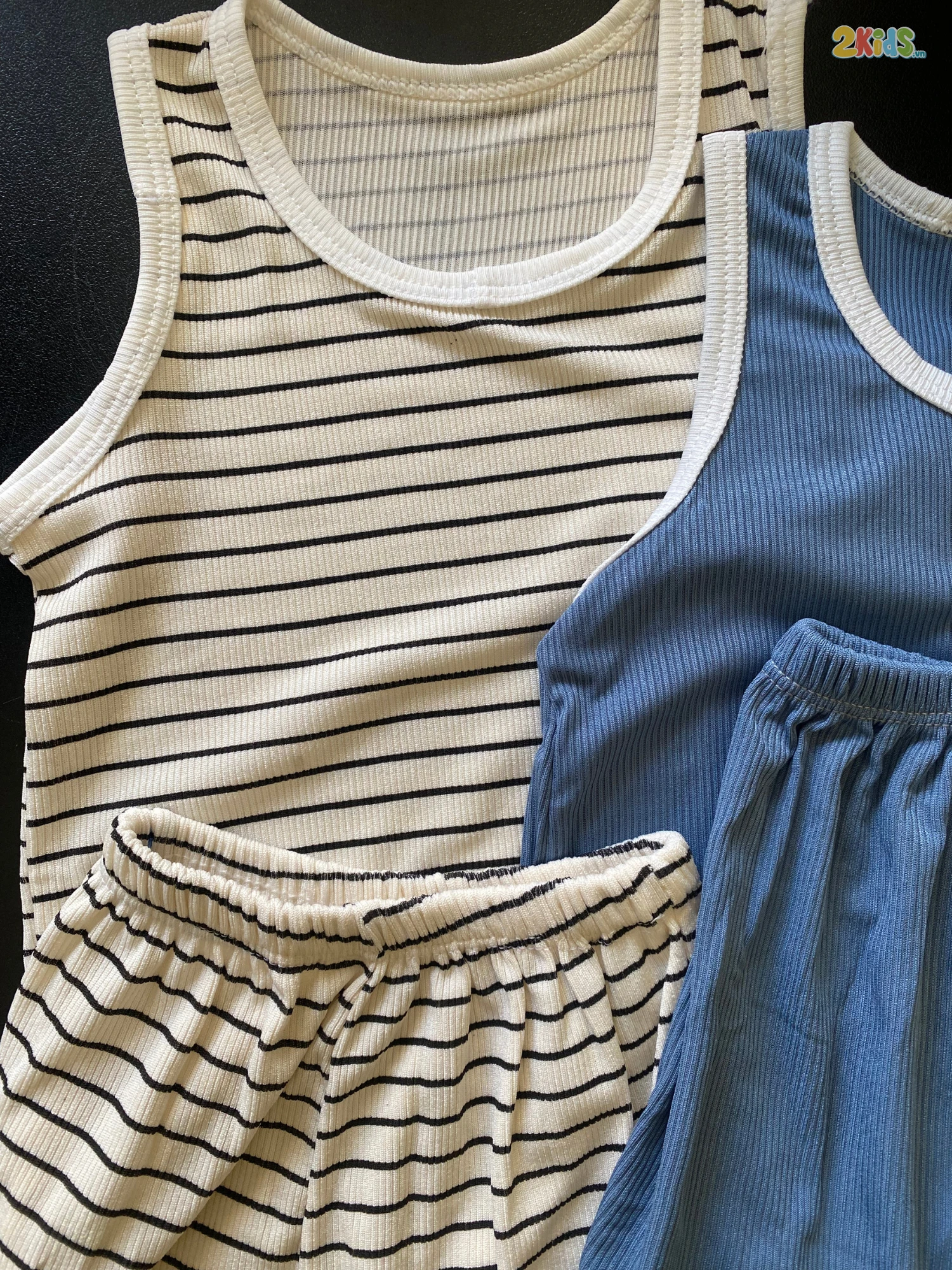 Thiết kế sọc ngang mảnh giúp bộ đồ trông gọn gàng và sáng sủa. Phần cổ áo, viền nách hoặc lai quần được phối màu pastel tạo điểm nhấn nổi bật nhưng không quá sặc sỡ, mang lại cảm giác nhẹ nhàng, sạch sẽ và đáng yêu cho bé.