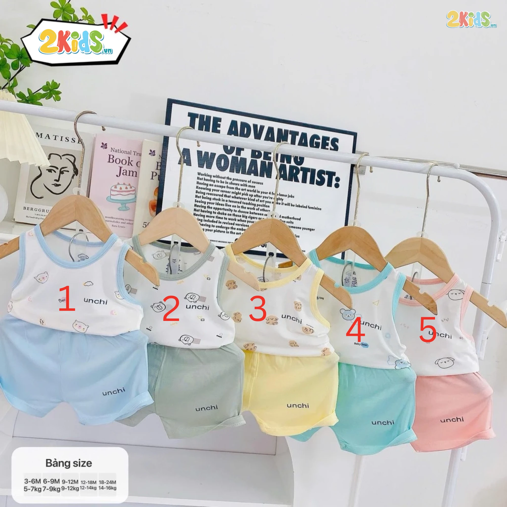 Combo 3 Bộ Quần Áo Sơ Sinh Unchi Ba Lỗ Trắng Phối Màu Họa Tiết