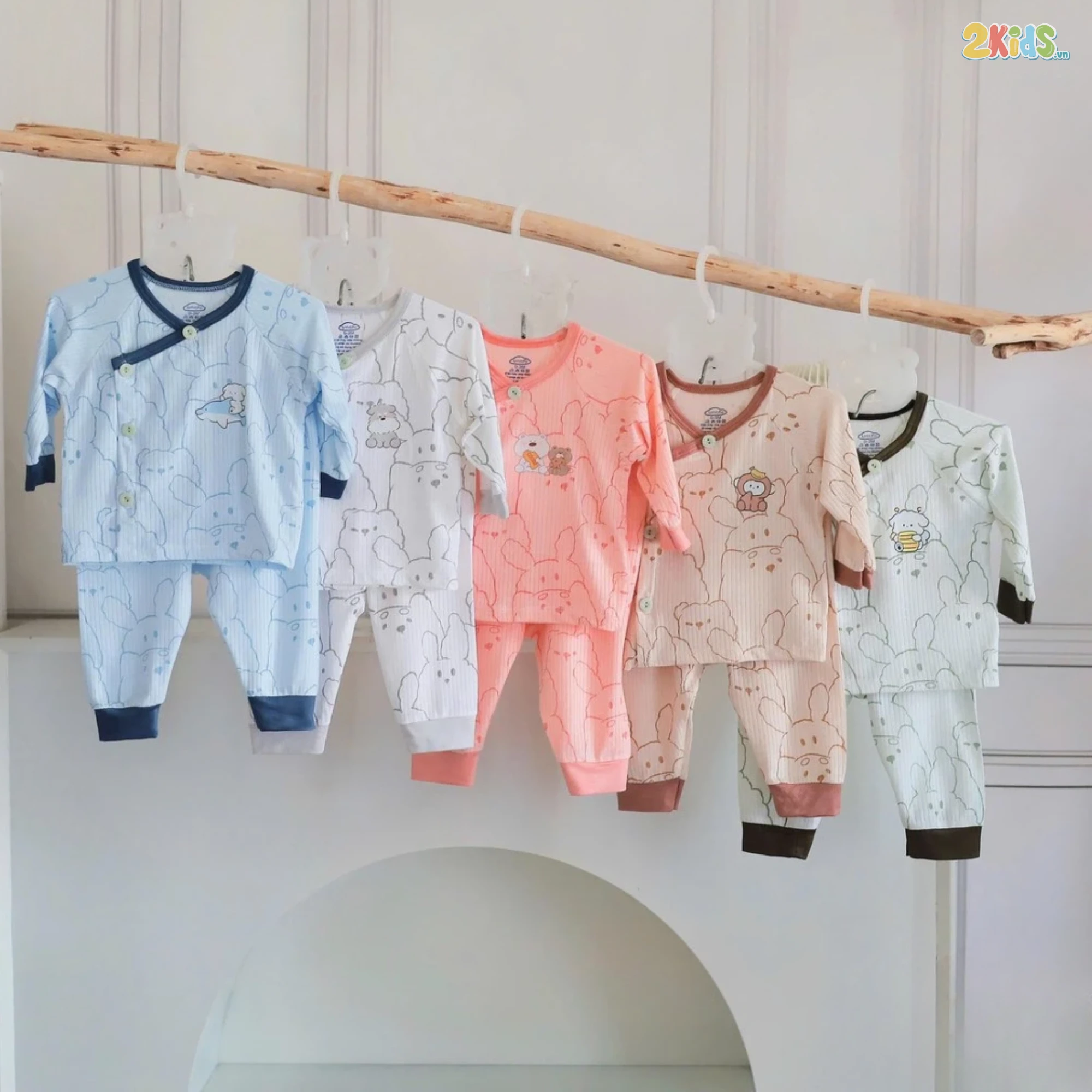 Áo được thiết kế dài tay với hàng cúc lệch truyền thống, vừa giữ ấm phần ngực và bụng bé, vừa giúp mẹ thay đồ cho con dễ dàng hơn mà không làm bé giật mình. Đây là kiểu dáng rất được ưa chuộng cho trẻ trong giai đoạn sơ sinh.